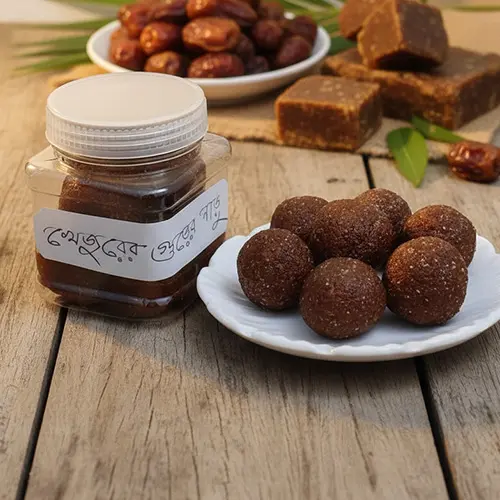 খাঁটি খেজুরের গুঁড়ের সাথে নারিকেল। সম্পূর্ণ ঘরোয়া পরিবেশে পাক সাফ ভাবে বানানো। একবার খেলে ইনশাআল্লাহ্ আবার অর্ডার করবেন
